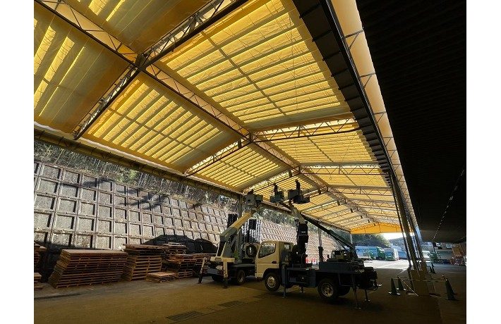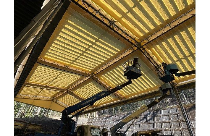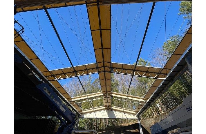 愛知県にて間口12.4m 奥行56m 軒高5.7m上屋テント(開閉式テント)の新設工事を行いました。