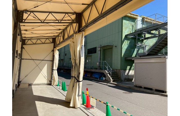 荷捌き場の上屋テント屋根のご案内。工場や倉庫などの荷捌き場に雨天対応のテント屋根を設置致します。柱数を極力減らし、強い強度・耐久性を実現致します。雨天時の荷物の積み下ろし作業や、荷捌き作業なども安心してご利用頂けます。小型サイズから大型サイズでも全て1つづつプロ職人が製作から施工まで対応させて頂きます。
